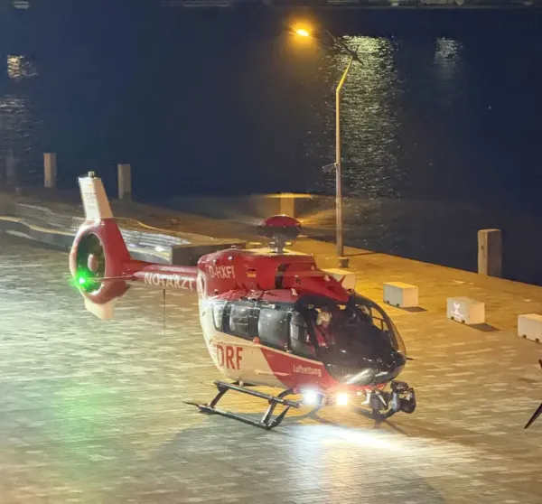 Doch die Einsatzkräfte der Freiwilligen Feuerwehr meisterten die anspruchsvolle Rettungsaufgabe und nach rund 90 Minuten, also weit nach Mitternacht, wurde das gestürzte Besatzungsmitglied in den wartenden Rettungshubschrauber, der aus Niebüll angefordert wurde, geladen und ins Krankenhaus geflogen.